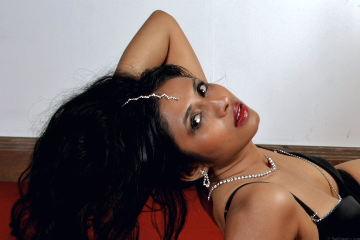 Beautiful Indian female sheds an overcoat to model in underwear and stockings
